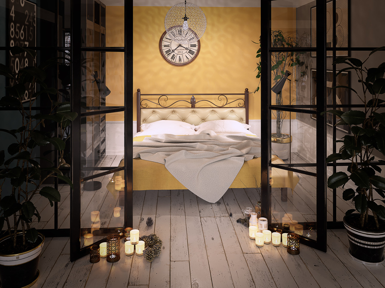 Двоспальне металеве ліжко зі вставкою в узголів'ї з екошкіри або велюру в стилі Прованс.